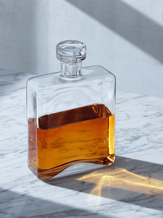La carafe de la collection CASK est soufflée à la bouche par des artisans qualifiés pour créer une forme contemporaine, aux côtés droits, de section oblongue. Le lourd bouchon cylindrique en verre est meulé à la main pour s'adapter parfaitement.