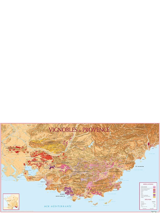 Cette carte représente les aires délimitées des A.O.C de la provence : Côtes-de-Provence avec ses extentions de Fréjus, de la montagne Sainte-Victoire et de la Londe, les coteaux d'Aix-en-Provence, Bandol, Palette, Cassis, Bellet, Coteaux de Pierrevert ainsi que le vignoble du Luberon. Le fond relief met en évidence les différents secteurs viticoles de cette grande région.