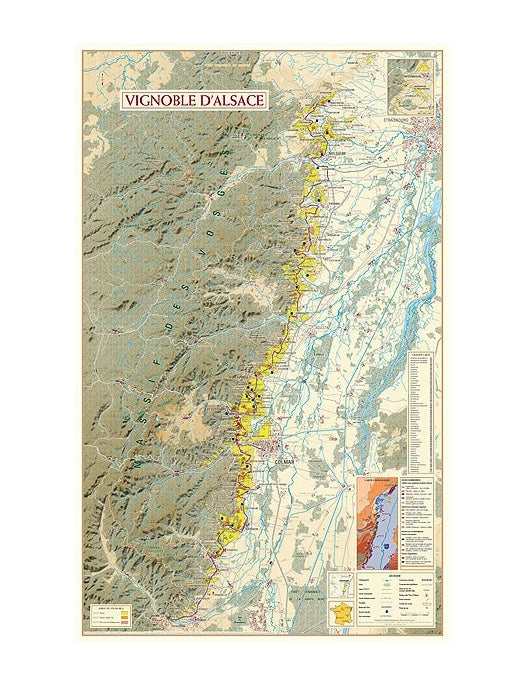 Une représentation réelle et très précise du vignoble alsacien avec mention et situation de toutes ses communes viticoles depuis Wissembourg jusqu'à Leimbach, la dénomination et la situation de ses 51 Grands crus et pour les repérer sur la carte un tableau alphabétique permettant de les situer immédiatement ; la route des vins de Marlenheim à Thann, les sentiers viticoles, les sites touristiques et une carte géologique.