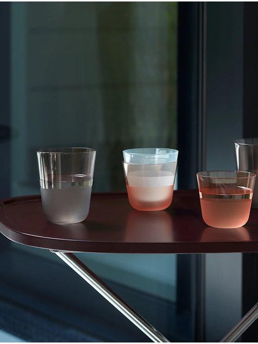 Inspirés par l’éclat des pierres semi-précieuses, les verres GEMS séduisent par leur texture cannelée et leurs reflets chatoyants. Chaque gobelet présente des parois fines et une forme basse empilable, décoré à la main dans des teintes irisées de la même famille chromatique.
