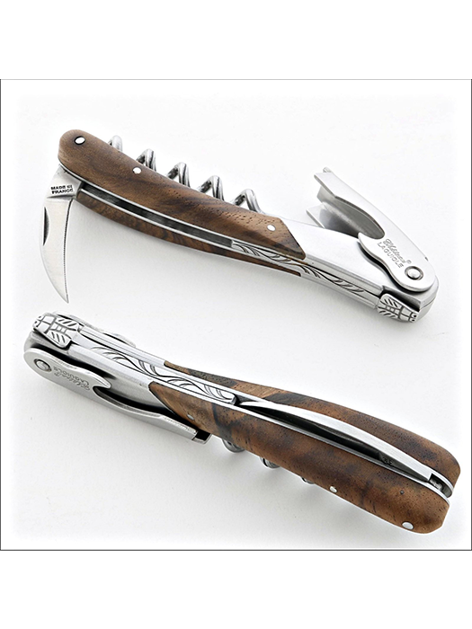 Refined and one-of-a-kind, the Château Laguiole Melchior corkscrew features a gunstock burled walnut handle, harvested in France. This richly grained wood is admired for its complex patterns and warm tones—each piece is entirely unique, making every corkscrew a personal treasure.