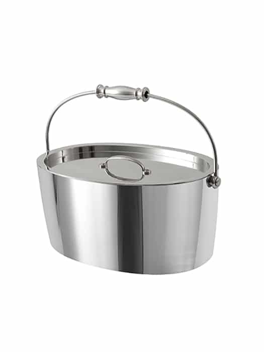 Unit price / perDouble walled stainless steel. Innovative and elegant the ice bucket’s low profile and oval shape make it easy to scoop out ice. It is sized to easily fit a six pack or 2 bottles of wine with ice. The interior drain grate keeps your ice away from water melt. The underside clip on the lid makes sure the lid has a home while serving up some cocktails.