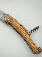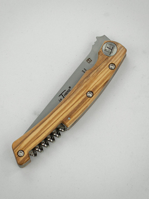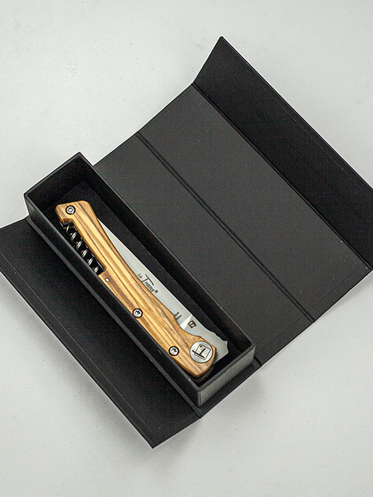 An agile yet bold tool, this pocket knife is foldable and perfect for taking on your gourmet travels. An incomparable cut, a long life and easy resharpening, this knife is a must-have. Featuring a highly secure opening and closing mechanism, a tightening axis for precision and safety, and a clever corkscrew, neatly stored in the elegant olive wood handle, this tool is both organically stylish and practical.