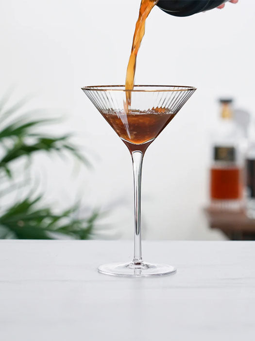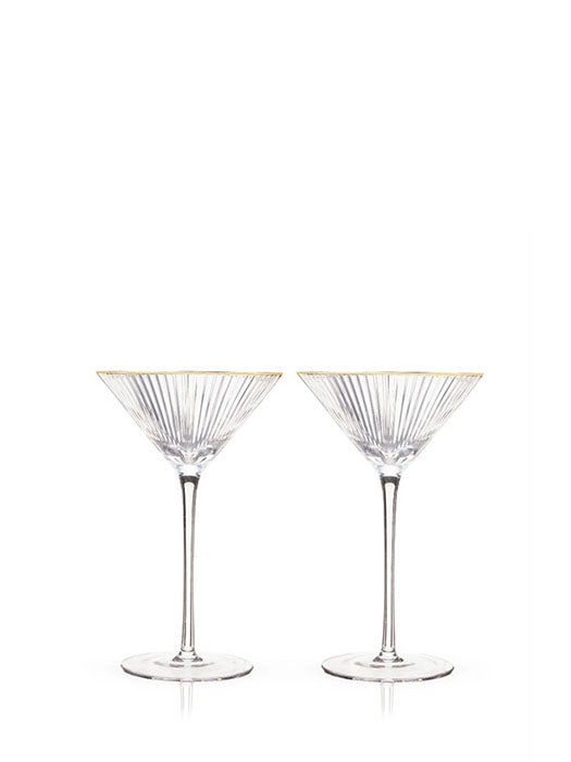 Classic silhouette meets unique details. Wavy crystal and gold rims make these martini glasses a stunning way to serve cocktails, from Martinis to Manhattans to Cosmopolitans.