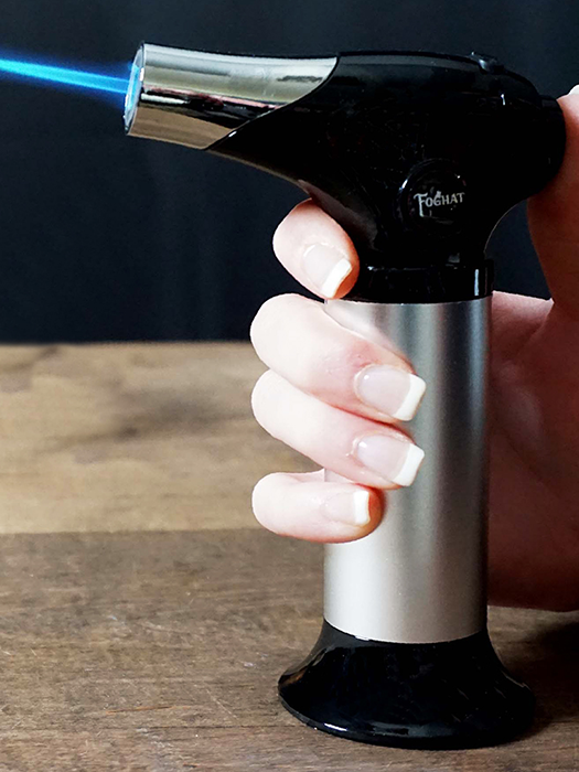 Professional Foghat butane kitchen torch, perfect for smoking cocktails, meats, and charcuterie. Piezo ignition, adjustable flame, built-in safety features. Essential for cooking, BBQ, and mixology.