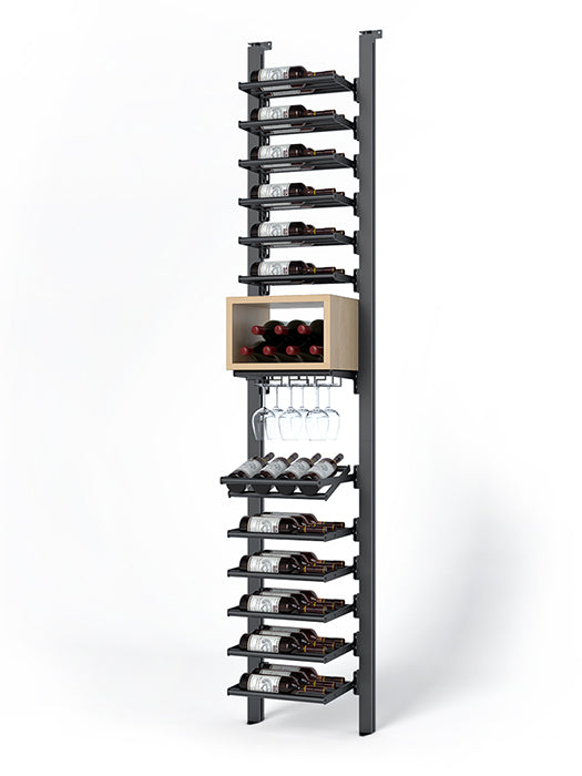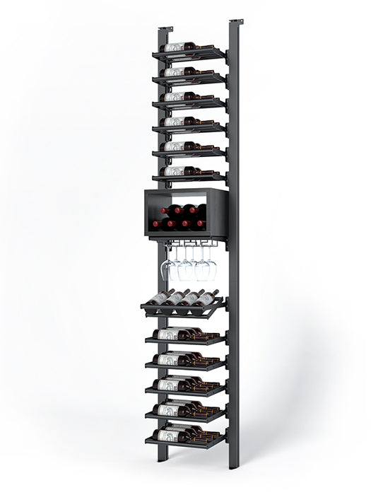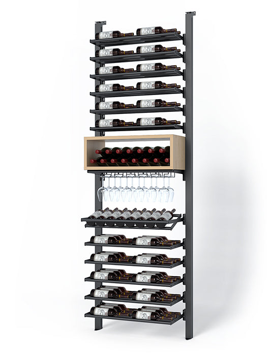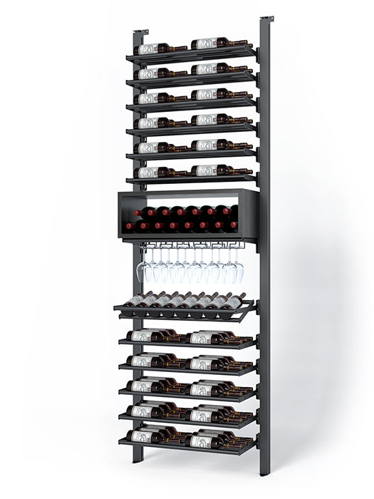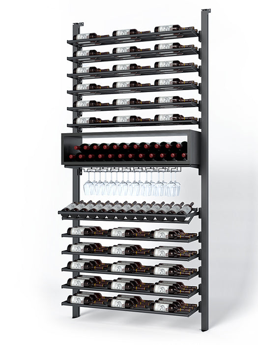 Made of aluminum, this collection's sturdiness is matched by the elegance of its clean lines. It offers impressive arrangement possibilities and great flexibility in bottle presentation. Ideal for the cellar or glass wine cellar, its configurations are equally suited to small spaces and large-scale layouts.