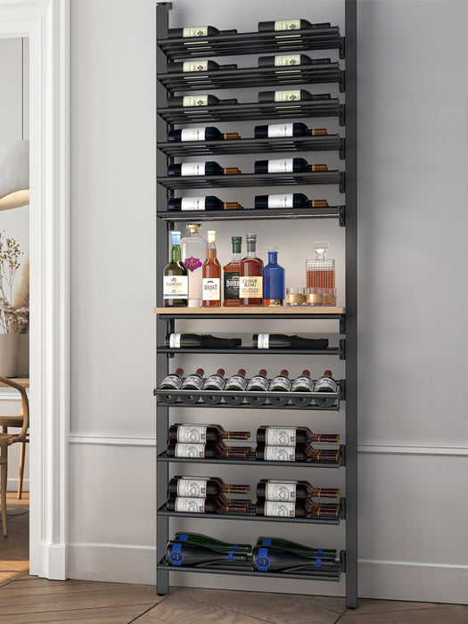 Made of aluminum, this collection's sturdiness is matched by the elegance of its clean lines. It offers impressive arrangement possibilities and great flexibility in bottle presentation. Ideal for the cellar or glass wine cellar, its configurations are equally suited to small spaces and large-scale layouts.