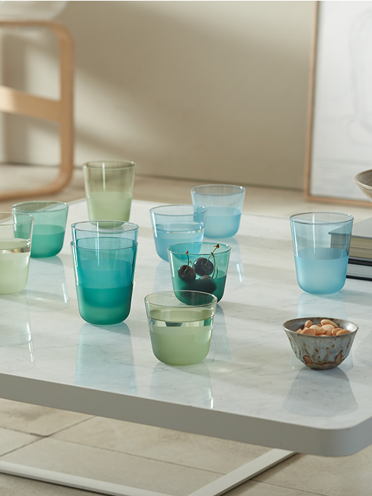 Crafted from soda-lime glass for exceptional clarity and strength, they feature fine walls, cold-cut and fire-polished rims, and an organically sprayed textured finish. Their stackable shape makes them easy to store, while their artisanal look is the result of refined manufacturing techniques that mimic handmade quality.