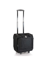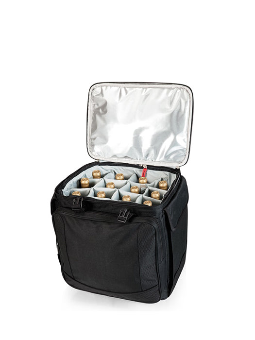 Unit price / perThis bag is an insulated twelve-bottle wine tote/cooler on wheels. It has a telescopic handle with push-button release and three large exterior pockets to fit three-ring binders, brochures, magazines or other personal effects. Unzip the interior bottle divider from the interior cooler compartment and there's a water-resistant liner underneath that converts the wine tote to a 40-can capacity cooler. Made of polyester with a heavy-duty comfort grip top handle and two locking clasps to secure its contents, you can be assured the bag will protect and insulate your bottle beverages wherever you take it.