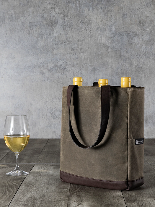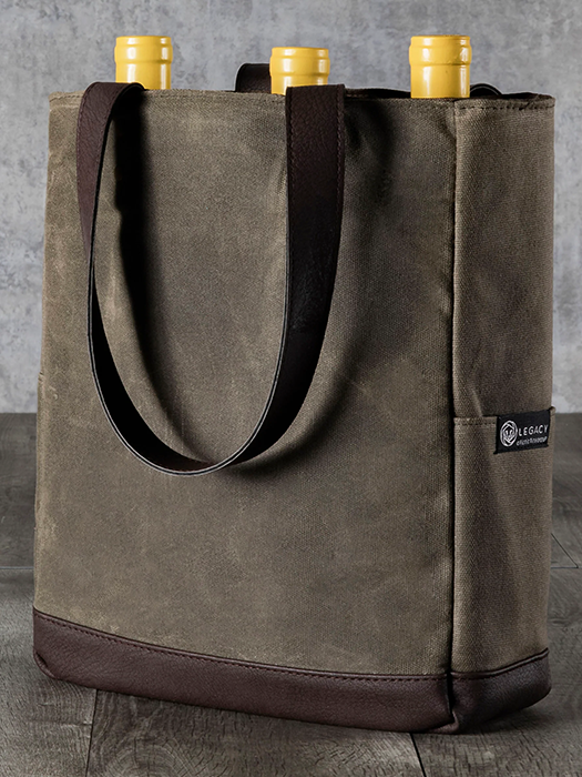 Insulated waxed canvas wine bag for 3 bottles, with removable padded divider and side pockets. Elegant and functional—perfect for picnics and wine lovers on the go.