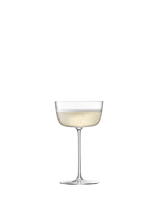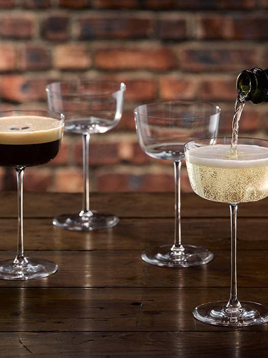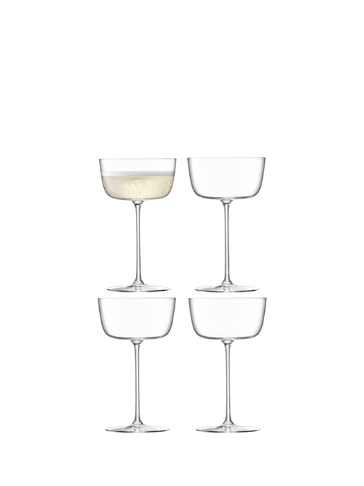 Set of four cocktail glasses with wide flared bowls and slim straight stems. Designed for martini cocktails or champagne. Made of lead-free crystalline glass for clarity and strength. A modern shape inspired by the relaxed atmosphere of local meals and gatherings.