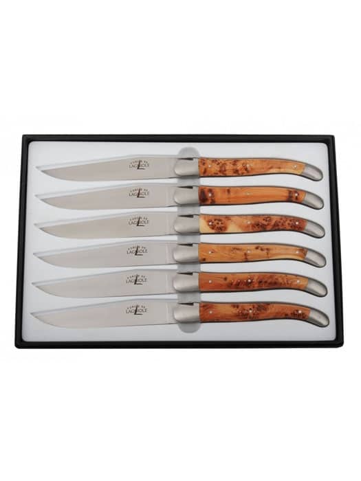 Prix unitaire / parCoffret de 6 couteaux de table, manche en genévrier, mitres en inox satiné.