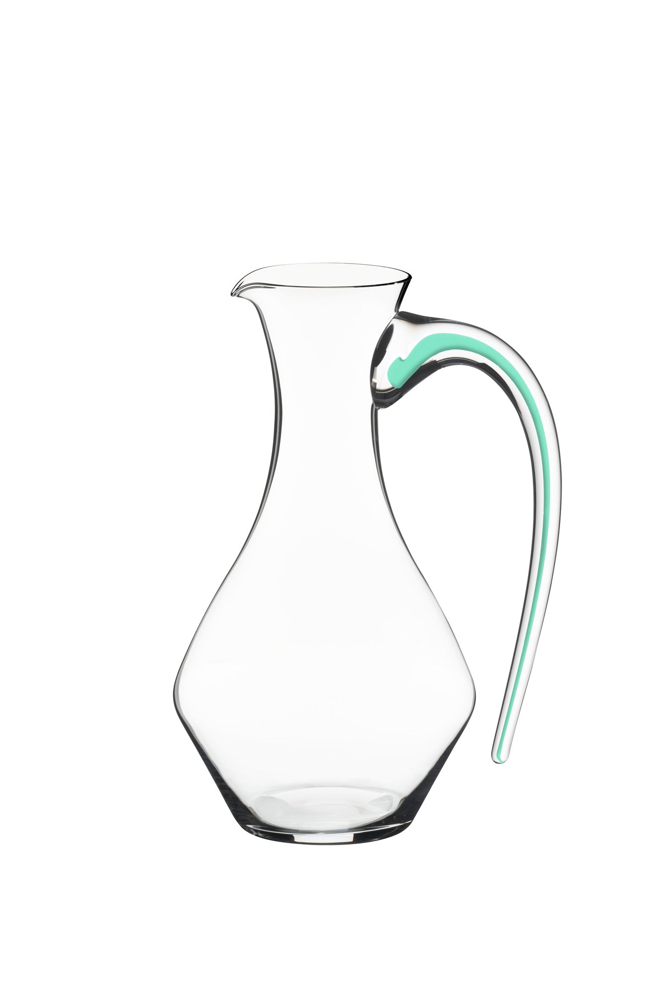 L’anse est traversée d’une bande colorée ou non, obtenue par l’insertion d’une tige de cristal couleur dans le verre en fusion avant que la carafe ne soit formée. Ce détail artisanal confère à chaque pièce un style unique. La carafe est conçue pour contenir une seule bouteille de vin de 0,75 L, et convient parfaitement aux vins rouges, blancs ou effervescents.