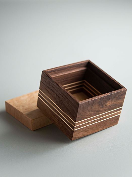 Boîte en noyer minimaliste avec insertions d’érable. Pour sel, épices, bijoux ou thé. Élégante, pratique, artisanale. Fait au Québec